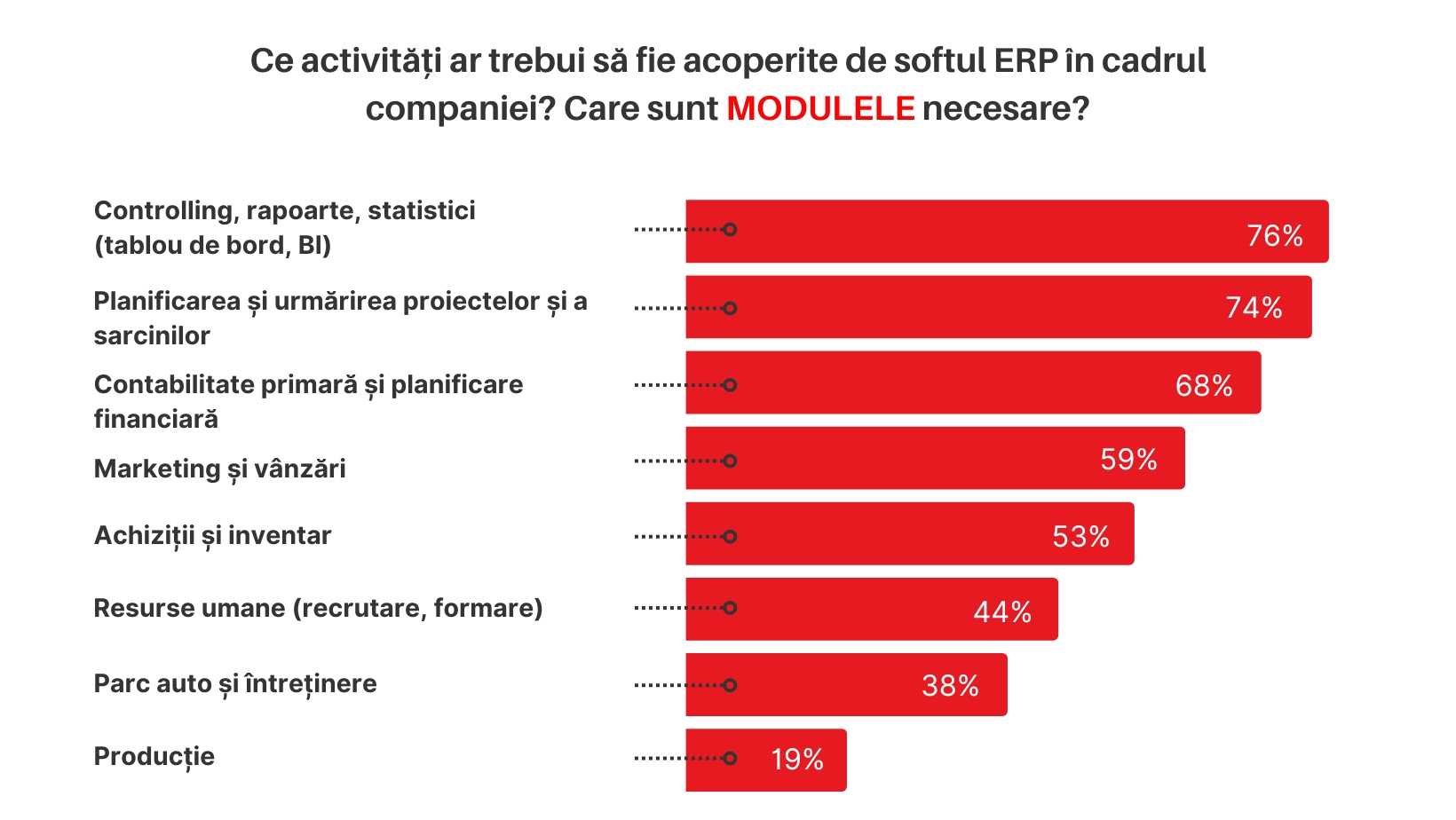 Este puțin ciudat că pe ultimul loc se află planificarea resurselor (utilaje, resurse umane, stocuri, finanțe), fapt pentru care a fost creat software-ul ERP (Enterprise Resource Planning).